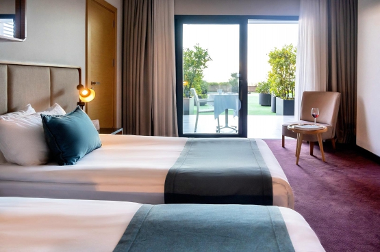 Bahçe manzaralıdır. 2 adet tek kişilik veya 1 adet çift kişilik geniş yataklı, çay- kahve set up’ı, Smart LED IP TV, balkon, duş, tuvalet, merkezi klima sistemi, direkt aramalı telefon, banyolarda telefon, mini bar, 24 saat oda servisi, çalışma masası, ücretsiz Wi-Fi internet erişimi, elektronik kasa, saç kurutma makinesi, makyaj aynası, terlik ve yastık servisimiz vardır. Ayrıca bağlantılı olarak da sunulan odalarımız 27 m² büyüklüğündedir.